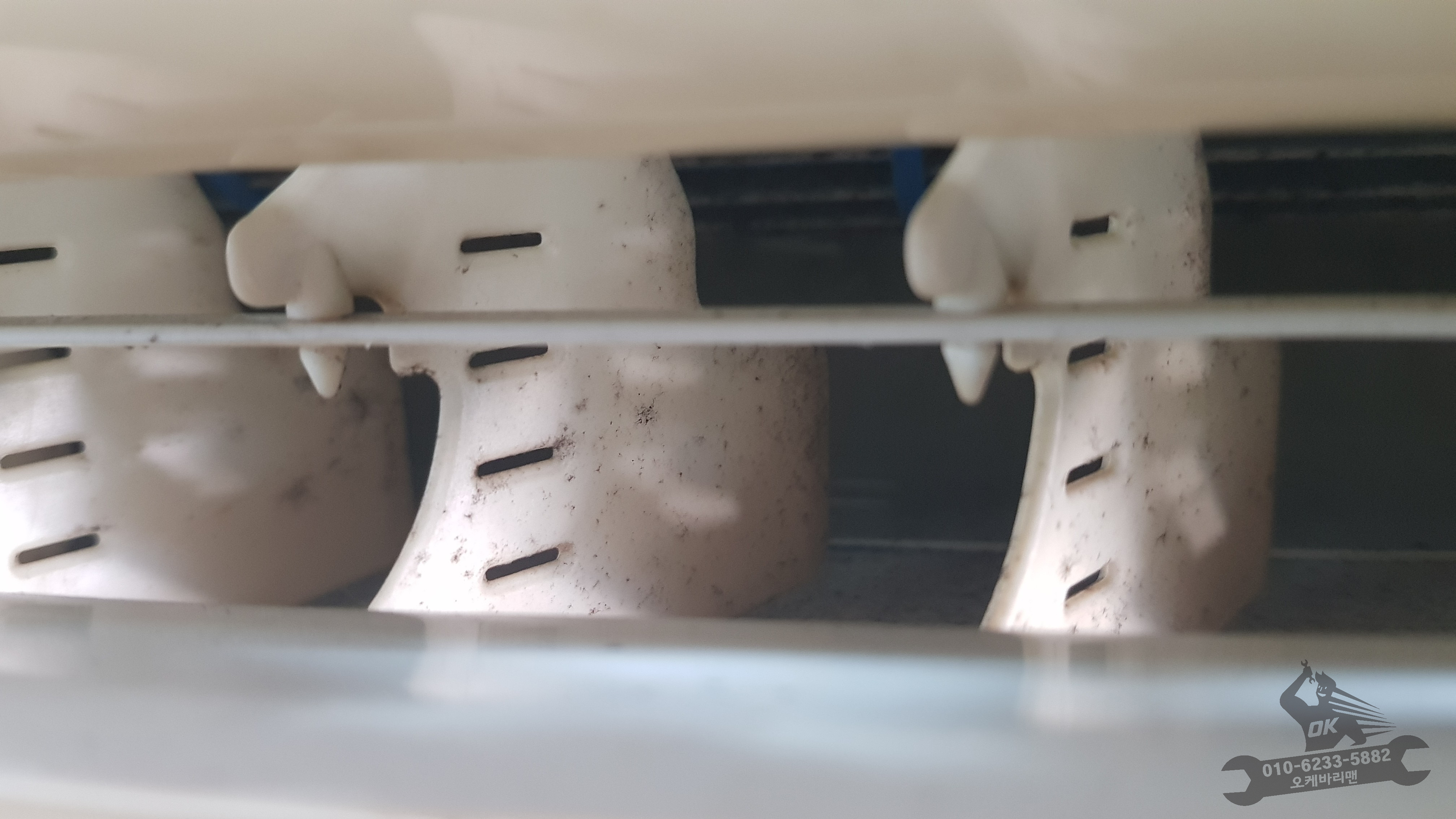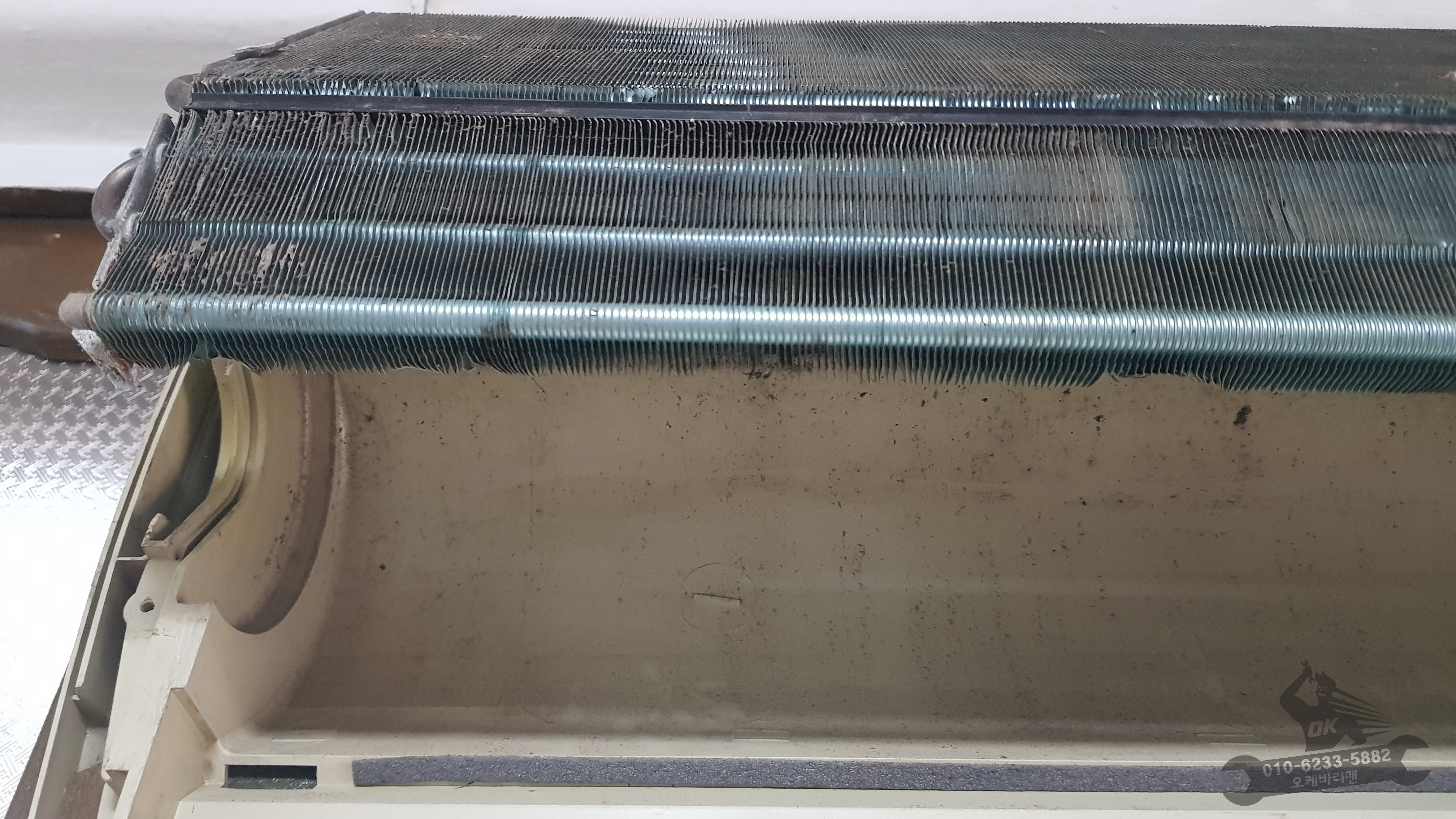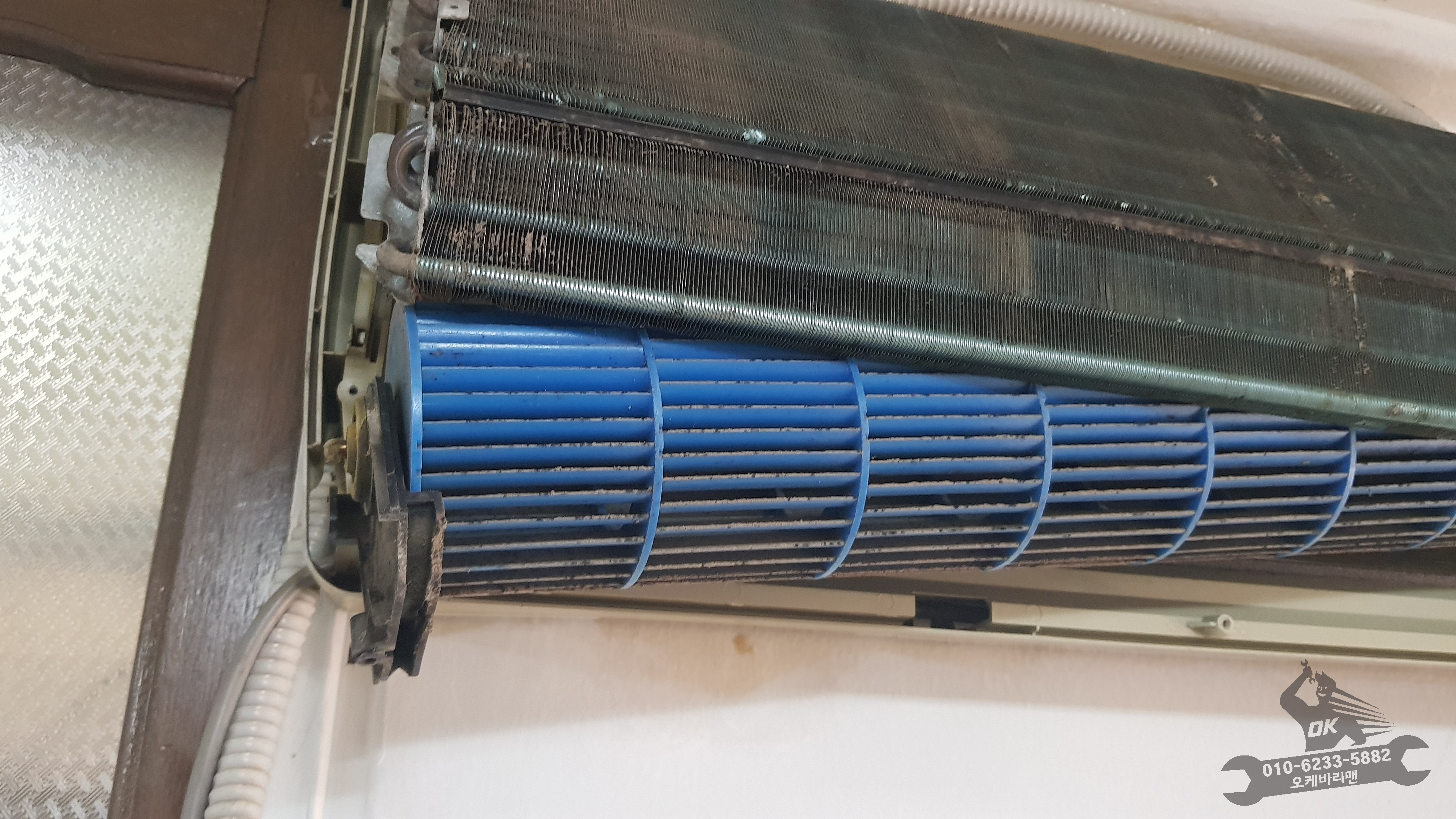 벽걸이에어컨 커버를 벗겨내면 라디에이터와 블로워팬의 오염도가 가장 심합니다. 당연히 이전부터 쌓여온 먼지와 곰팡이들이 자리를 잡은터라 깜짝 놀랄정도로 심각합니다