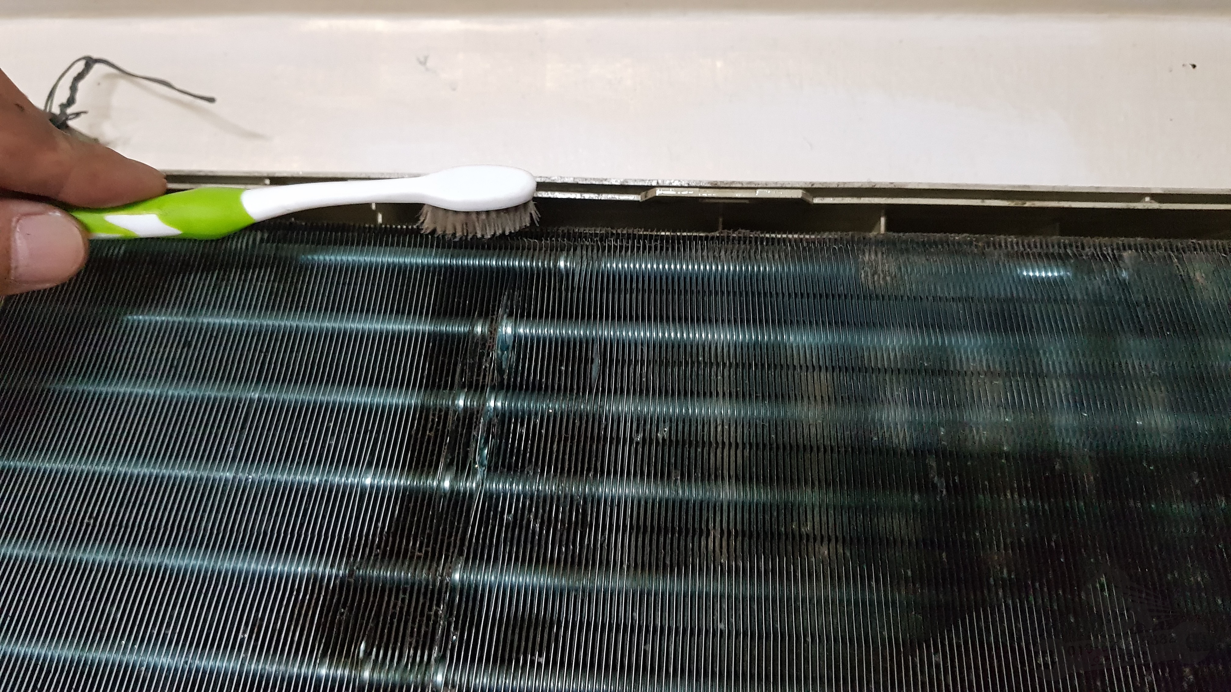 에어컨세정제도 다 썼고, 다시 다이소를 찾아가기도 그렇고 아까 작업할 때 사용했던 오렌지세정제를 충분히 뿌려주고, 결국 못쓰는 칫솔을 가지고 와 라디에이터 사이를 모두 닦아줍니다. 오, 괜찮은데???