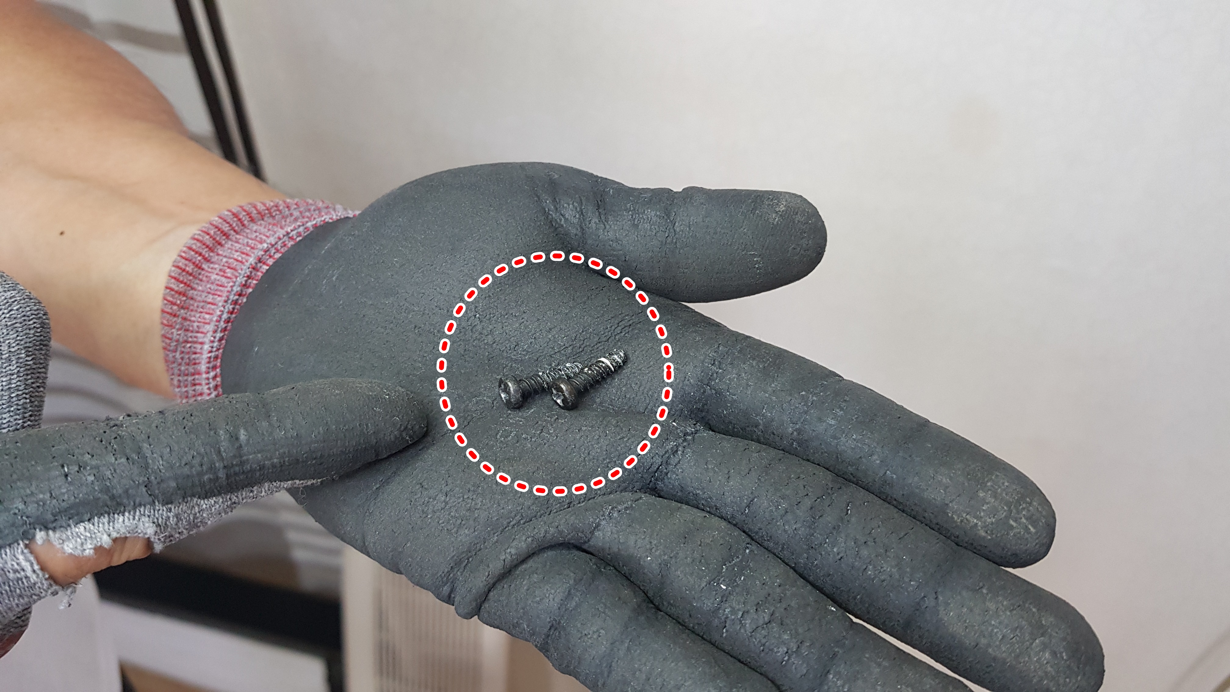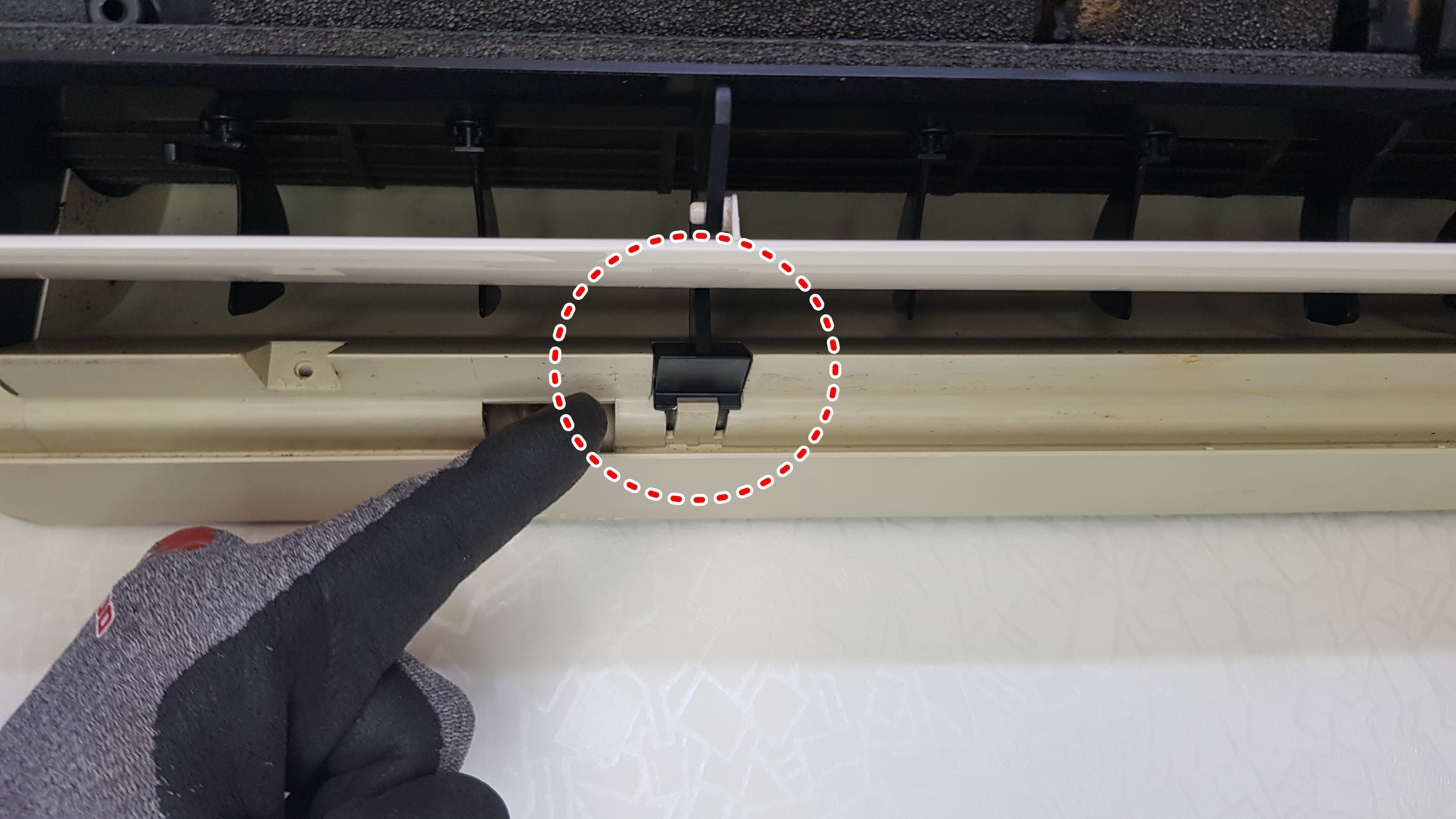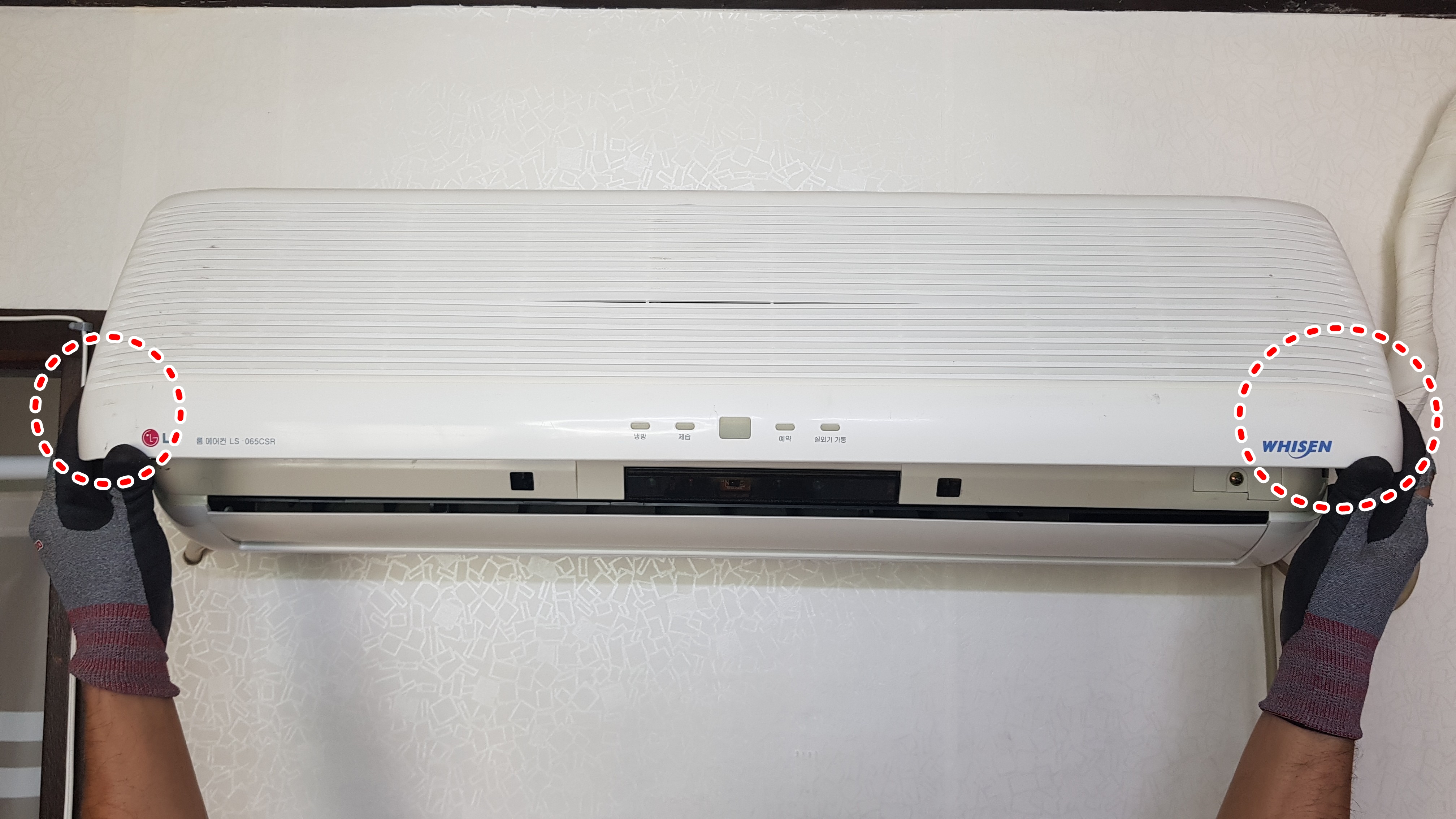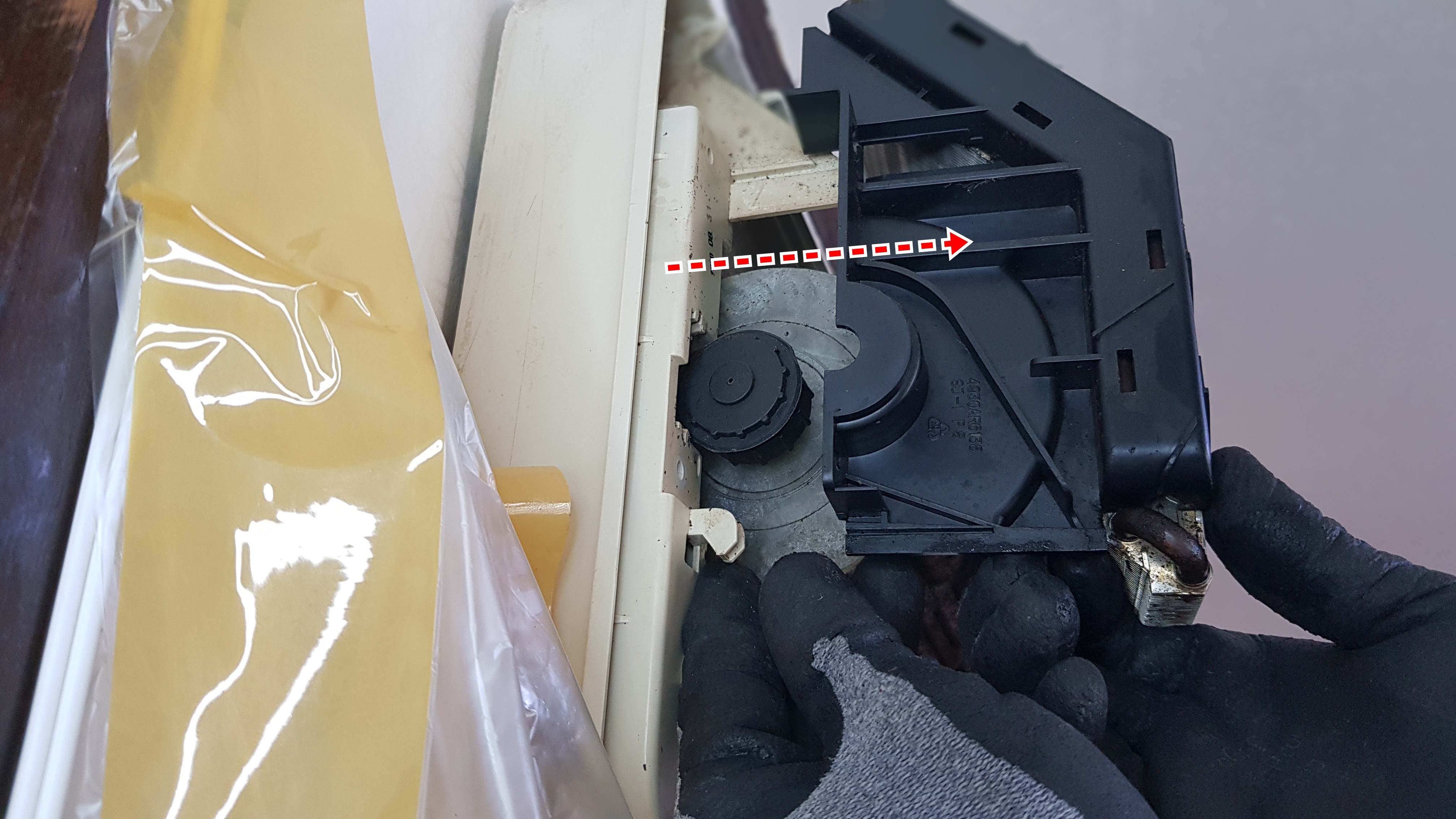 장갑을 낀 사진 보이시죠? 지난번 다른 벽걸이에어컨 작업을 할 때 장갑을 끼지 않았다가 손가락에 상처를 입었던 경험에 힘입어 오늘은 장갑을 착용하고 힘을 적당히 분배하면서 조금씩 송풍팬을 빼내고 있습니다.
