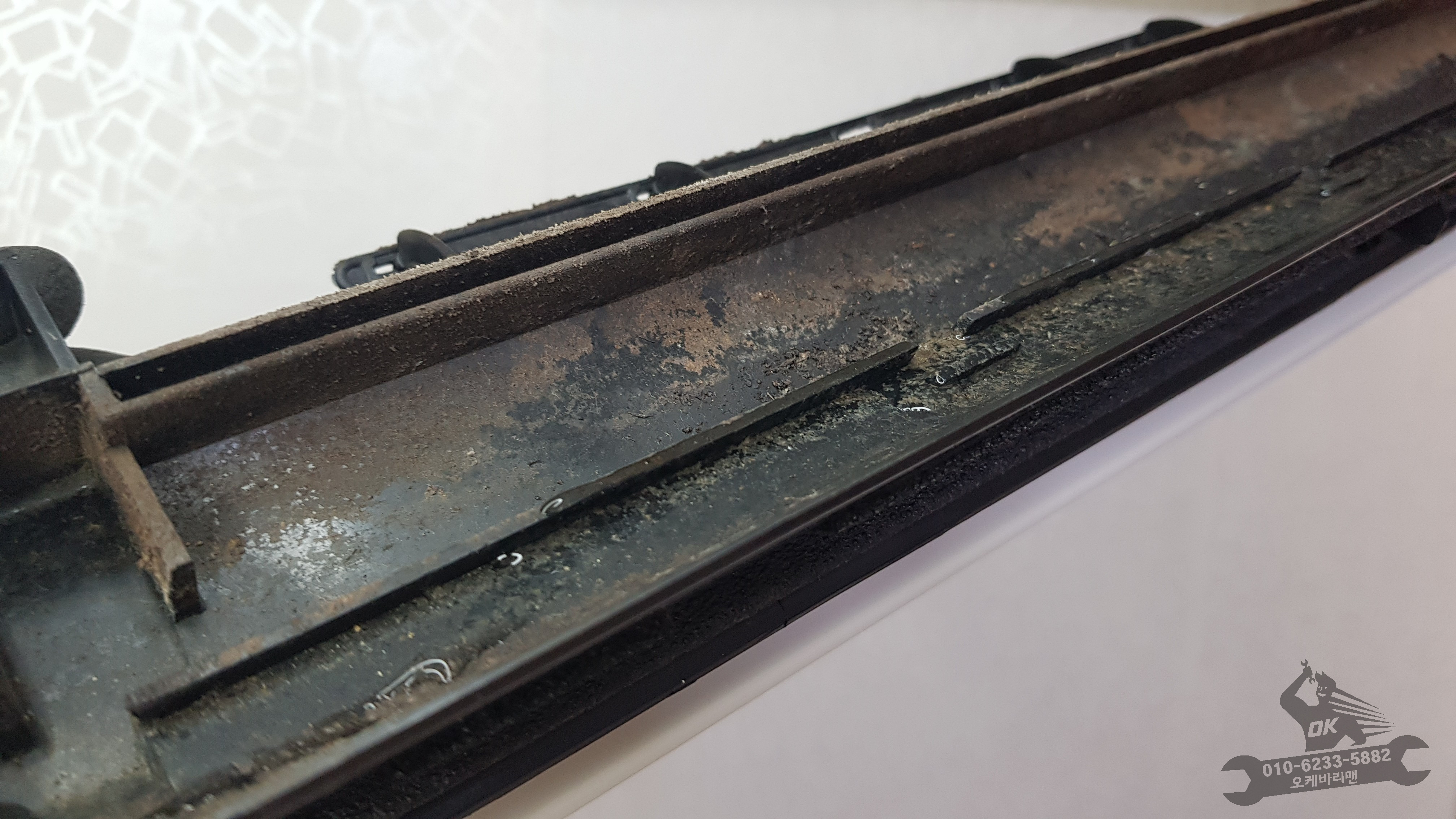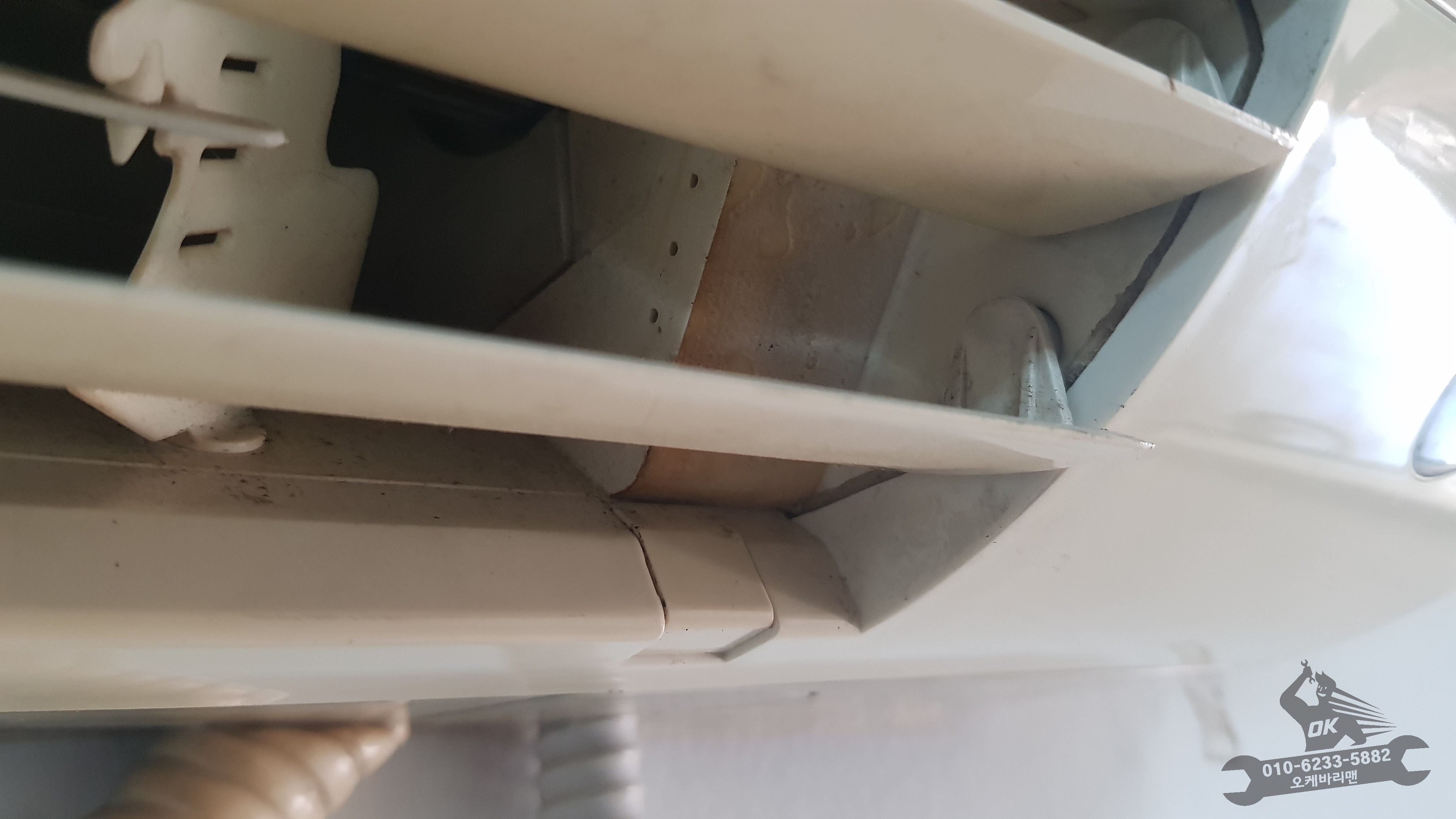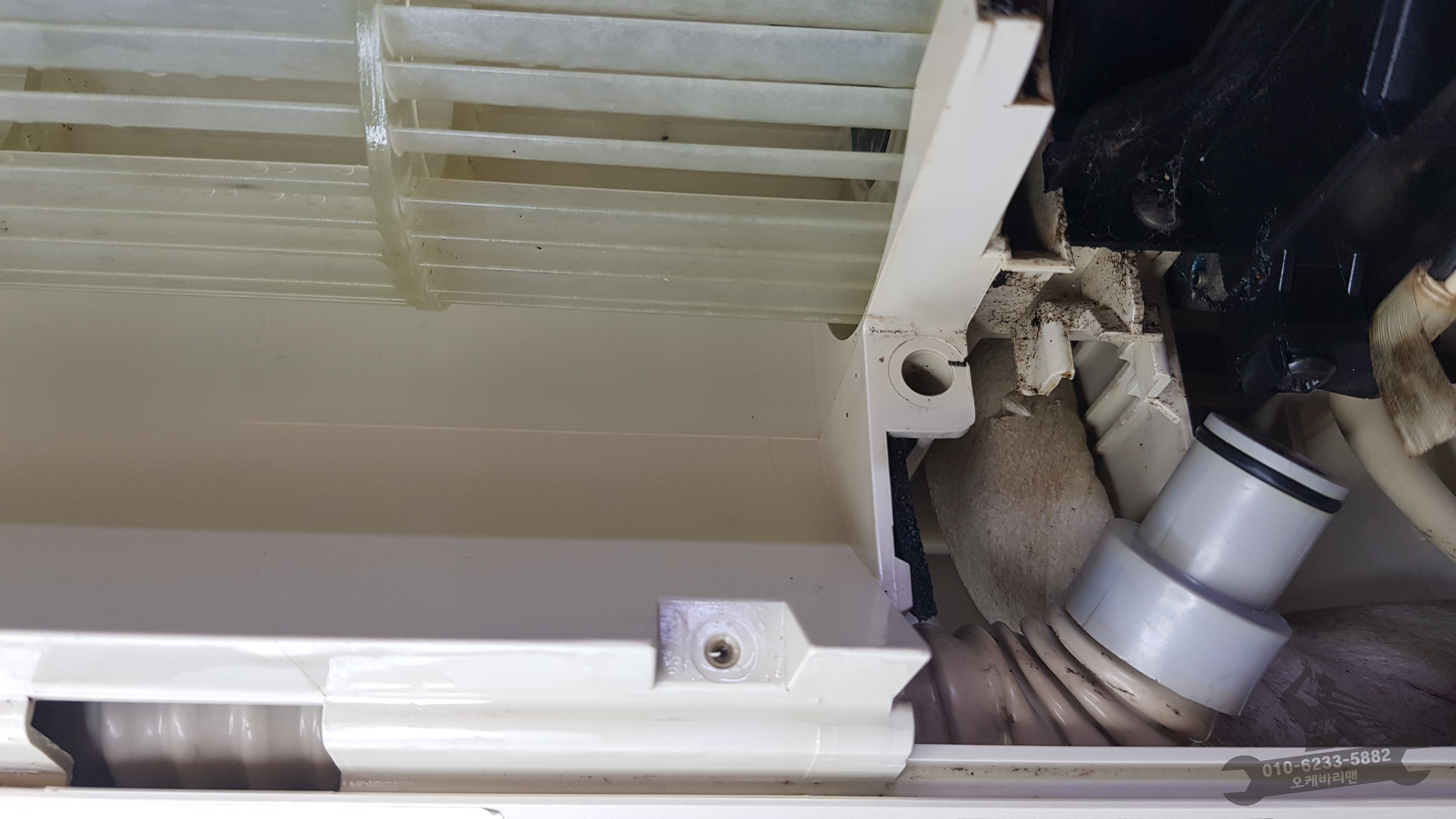 그동안 볼 수 없었던 물받침대입니다. 오른쪽 사진의 동그란 구멍으로 고여있던 물이 흘러나가는데요. 이쯤되면 에어컨에서 왜 악취가 났었는지 설명조차 필요없습니다. 곰팡이나 세균은 또 어땠을까요???