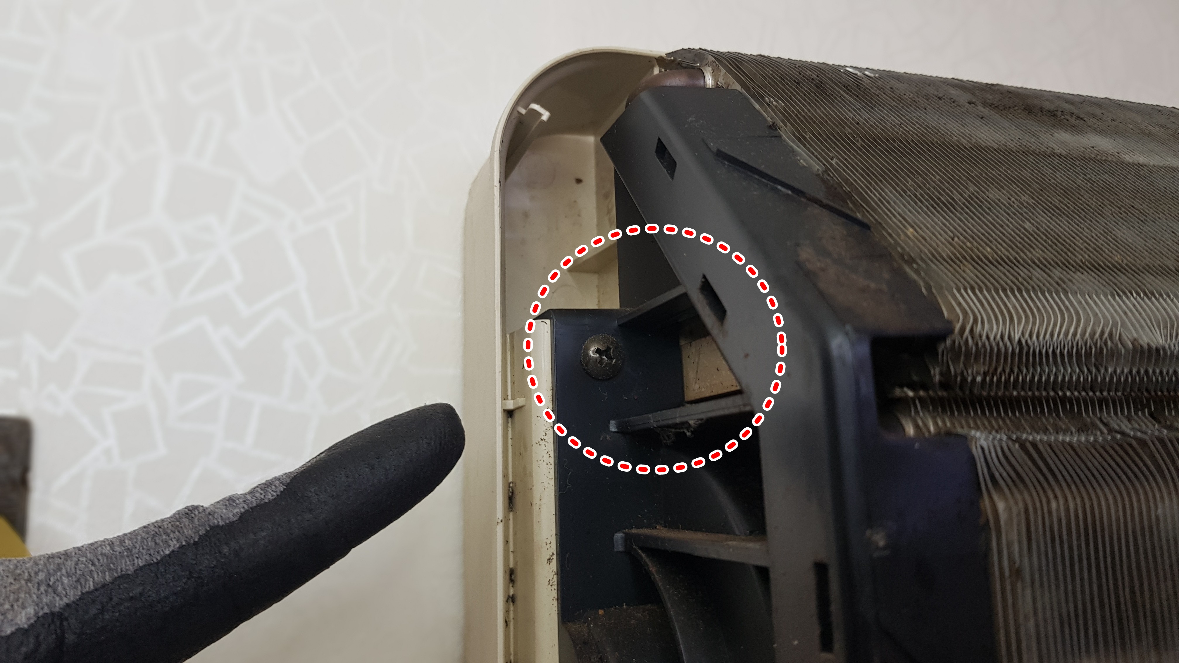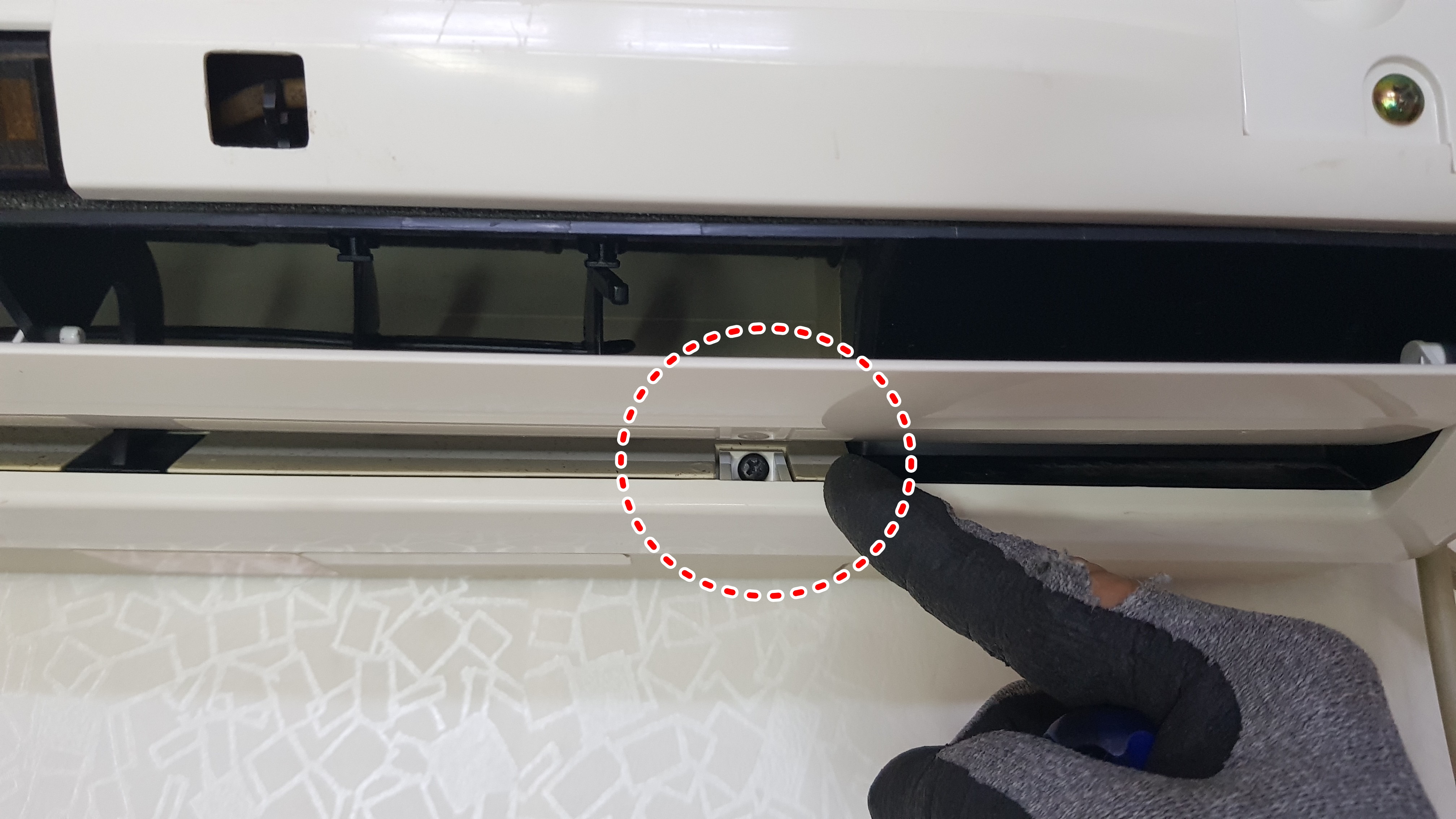 아래에서 보시는 사진은 다른 브랜드의 벽걸이에어컨인데요. 이처럼 캡으로 가려져 있는 경우도 있는데, 역시 조금만 생각하면 뭔가 있겠구나라는 직감이 들고 살짝 걷어내면 나사가 보입니다. ^^