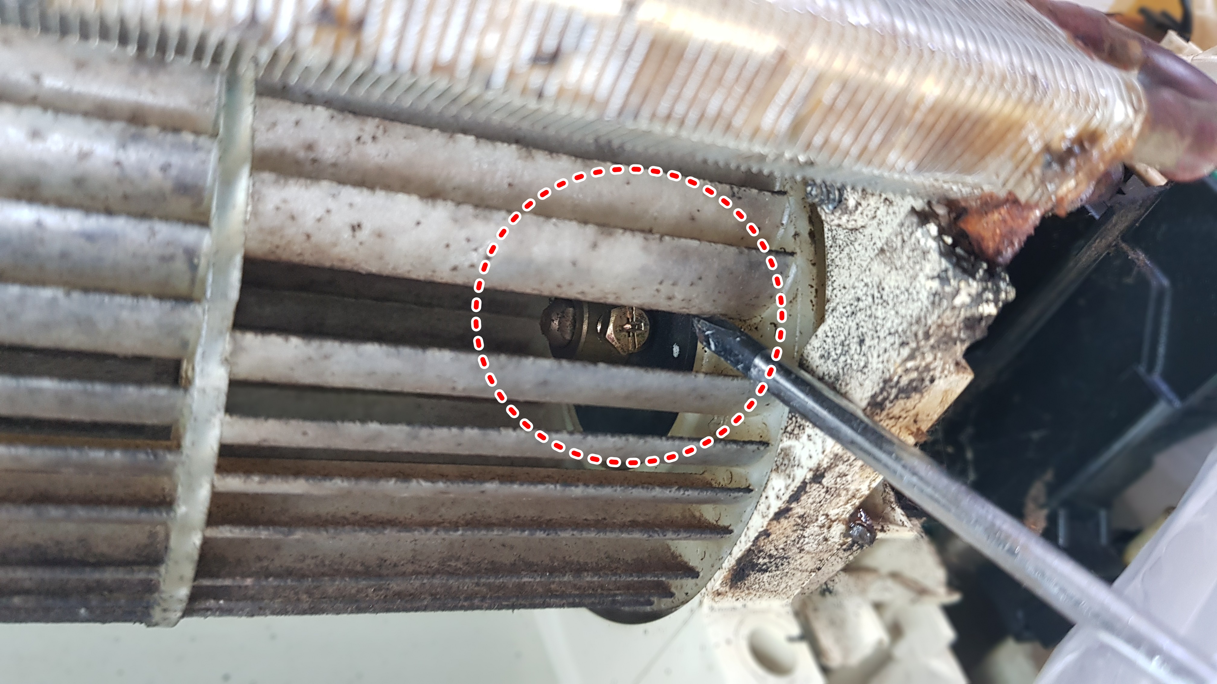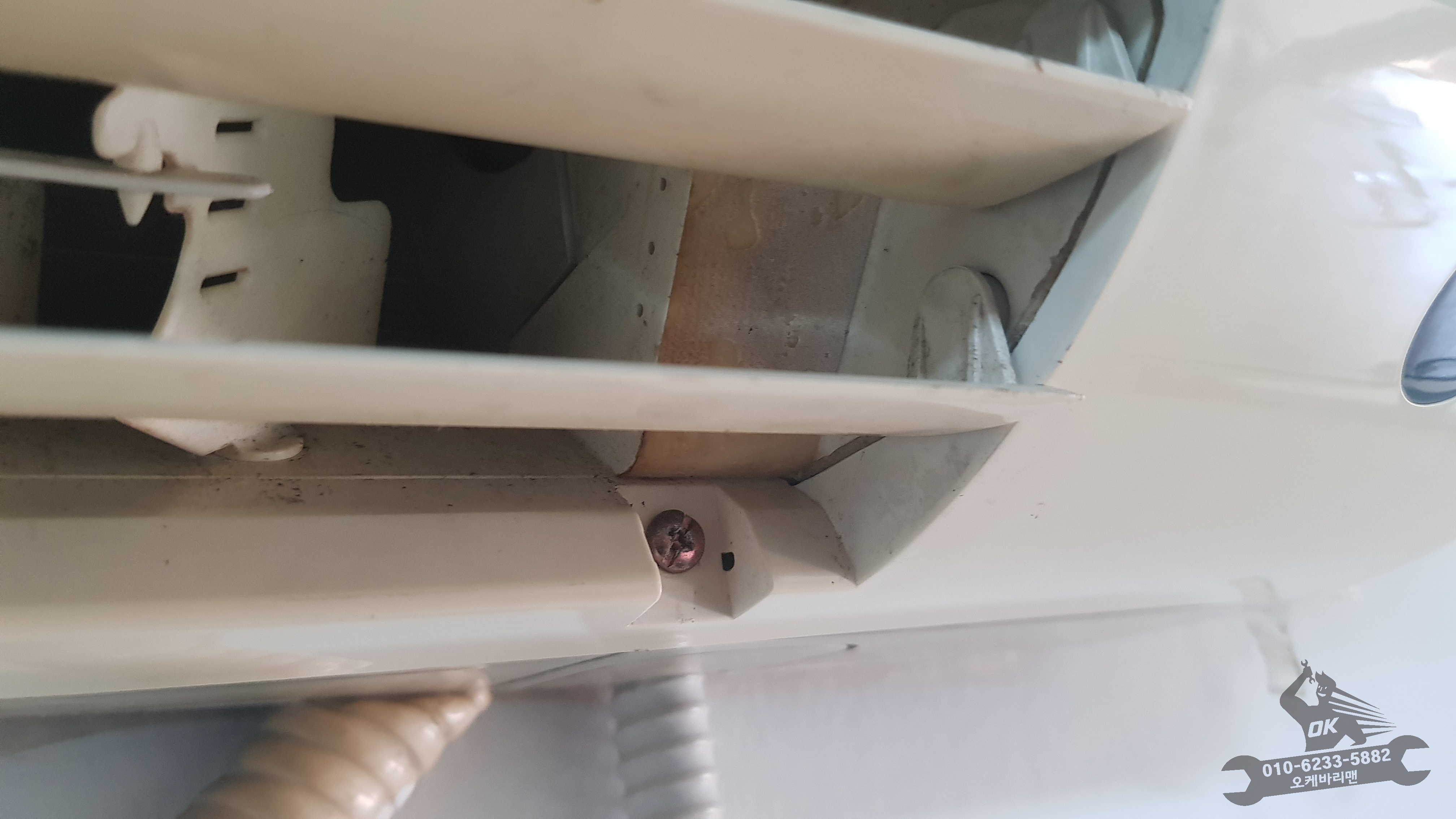 물받침대가 사라진 에어컨내부의 모습입니다. 벽을 타고 내려오는 오염물질이 보이는데요. 더 깊이 청소를 해볼까 살펴본순간???