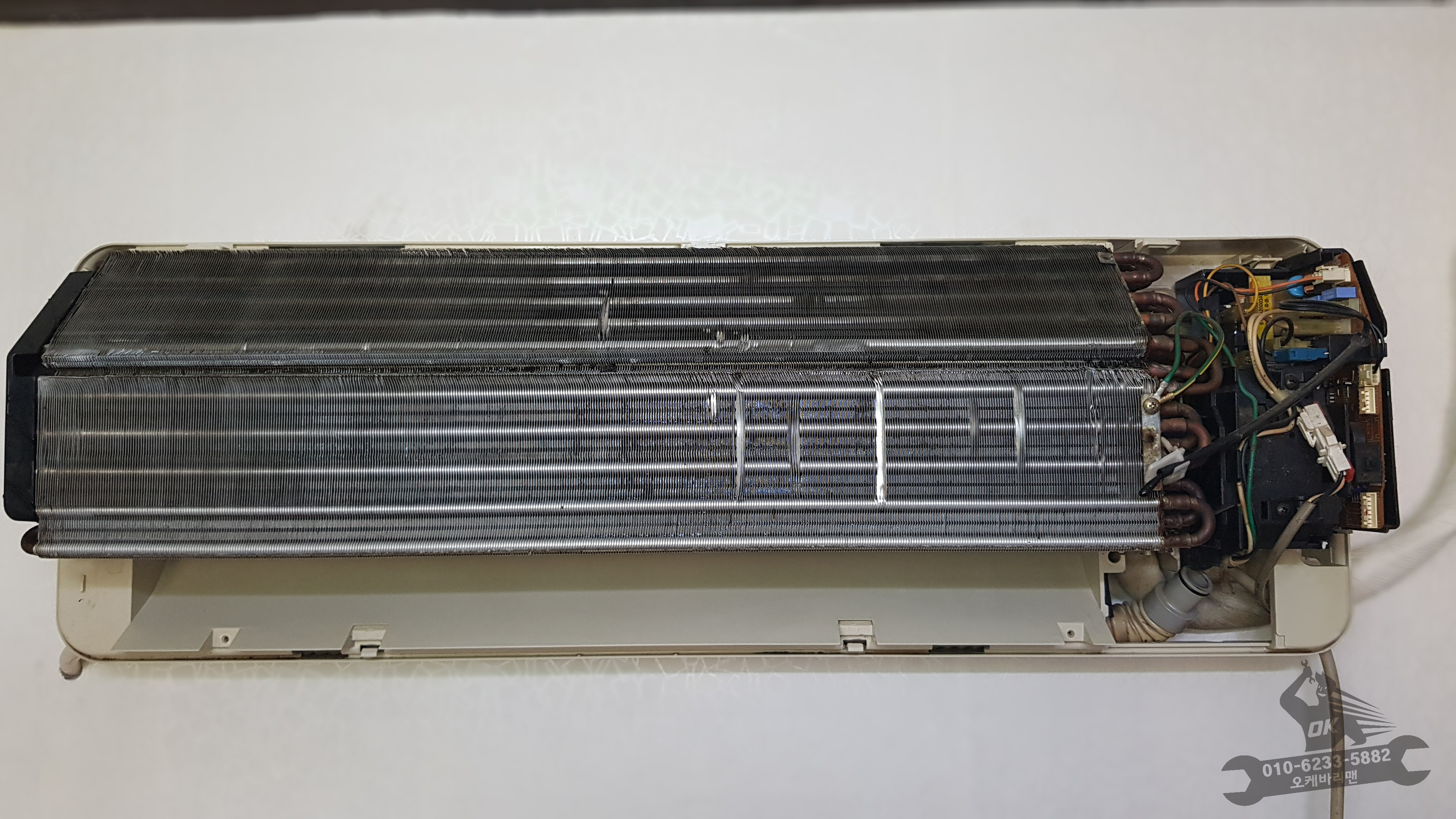 커버가 벗겨진 벽걸이에어컨입니다.