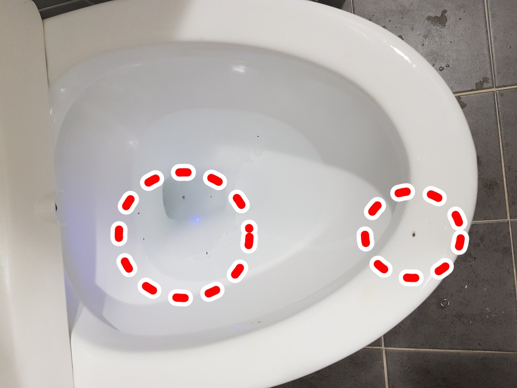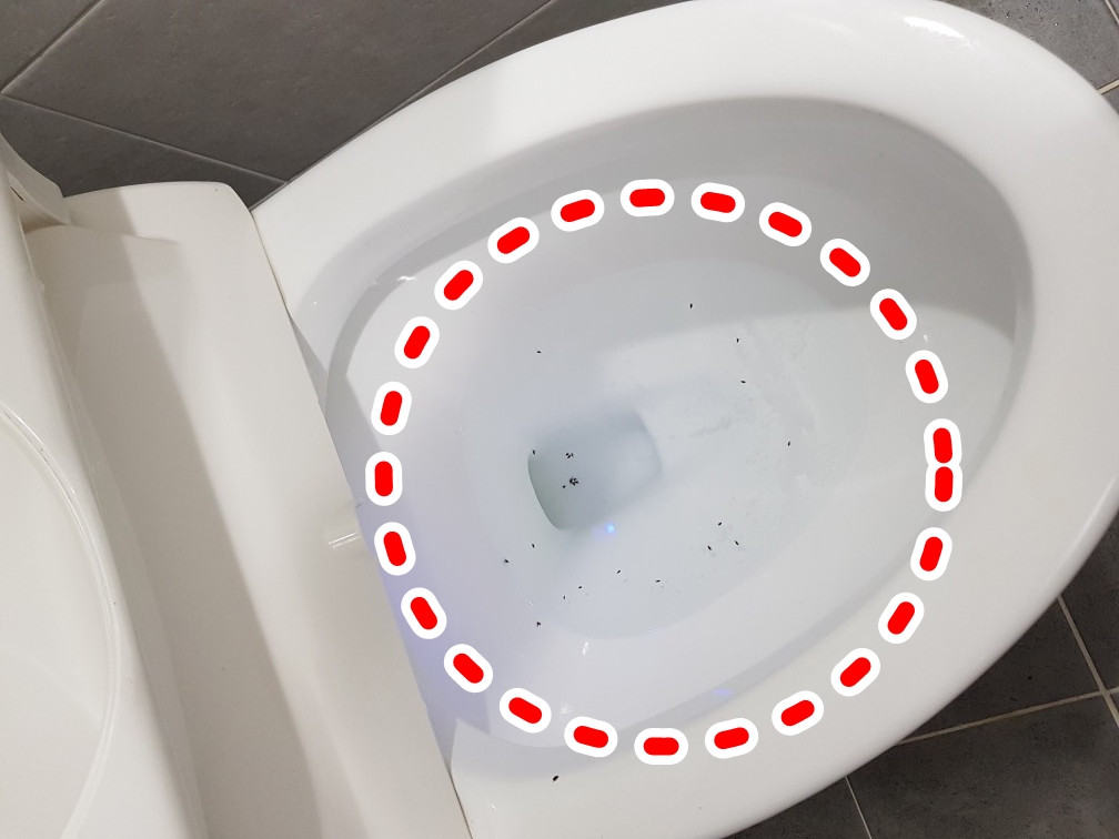 고객님이 보내주신 문자의 사진인데요. 변기에 까만점들이 모두 나방파리 애벌레입니다. 저렇게 많은 개체수가 있는 것은 가정집에서 흔치않은 상황입니다. 이렇게 나방파리가 많은 이유는 고객님께서 보내주신 사진으로도 짐작할 수가 있습니다.