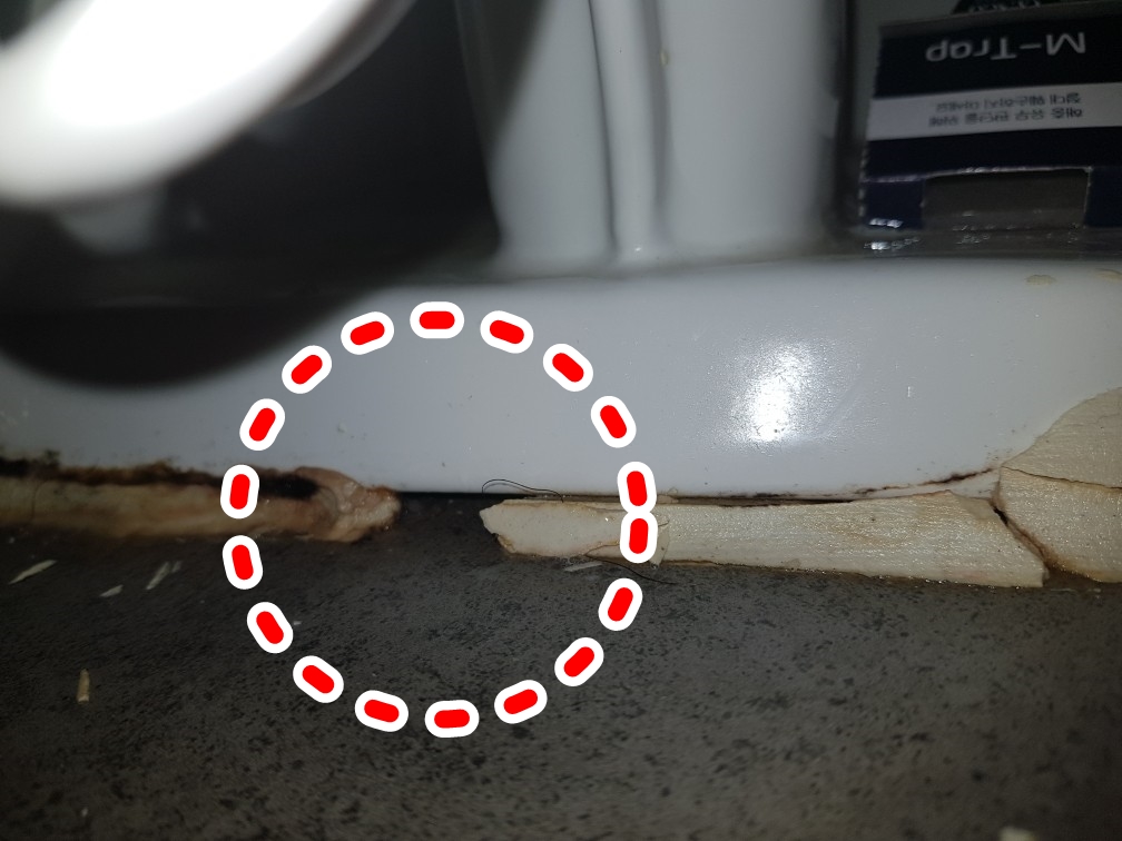 자세히 보지않고선 투피스형변기라고 생각했지만 막상 방문을 해보니 치마형 양변기의 뒷부분이었습니다. 변기아래 백시멘트는 어떤 원인으로 인해 파손이 되었고, 보수를 하지않아 변기를 사용할 때마다 미세하게 오물이 흘렀던 것으로 보입니다.